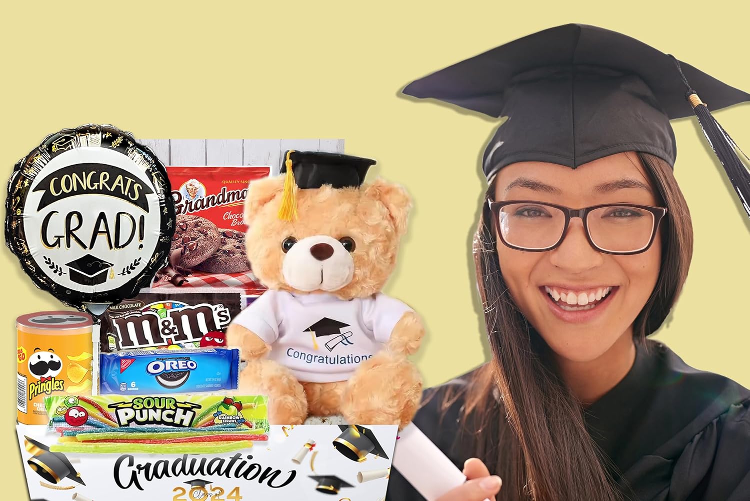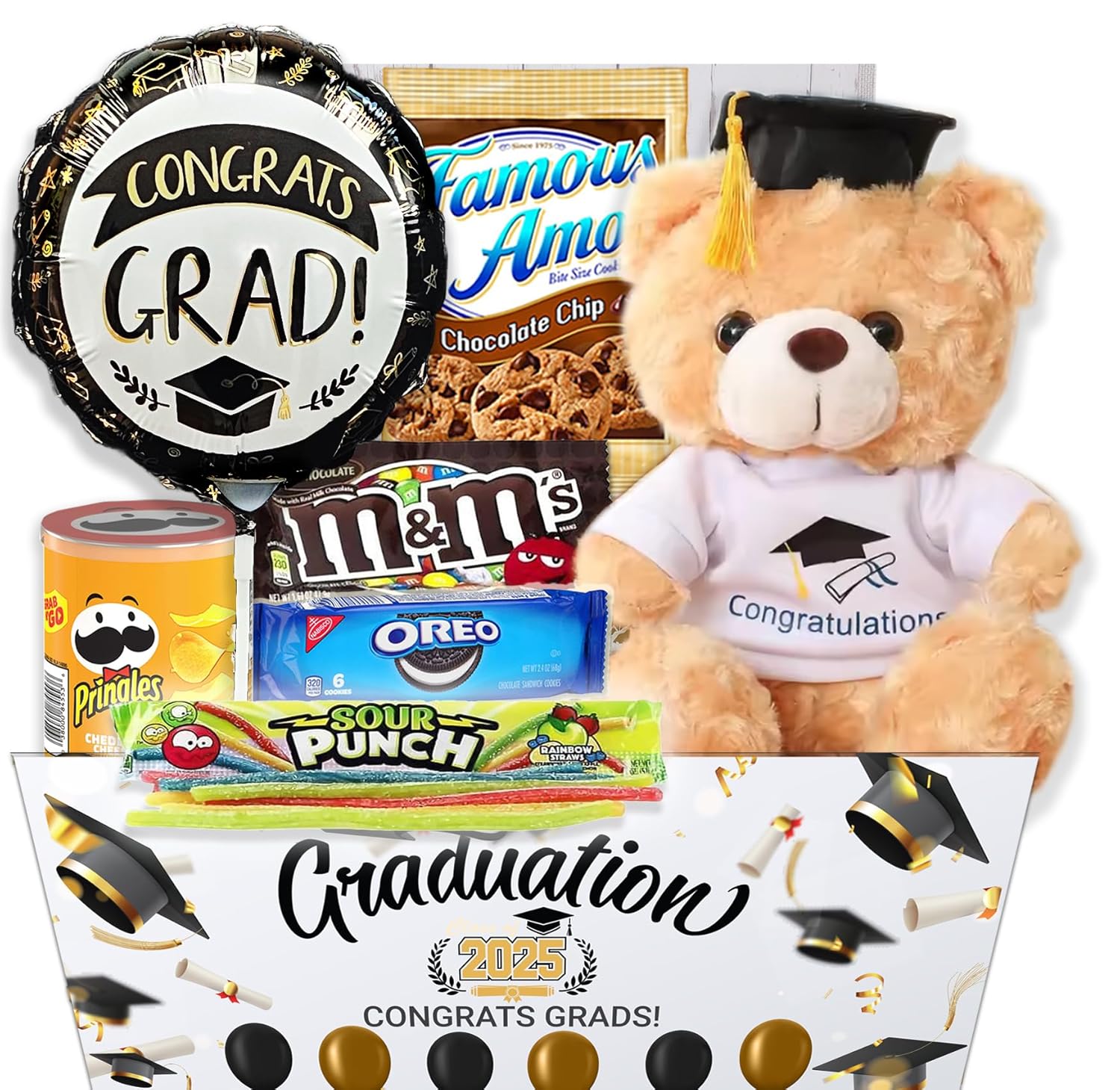 2025 Graduation Gifts Set Care package, Congrats Grad Gift Basket Set Include Balloon, Candy Cookies & Snacks Teddy Bear for Senior College Graduated Boy/Girl