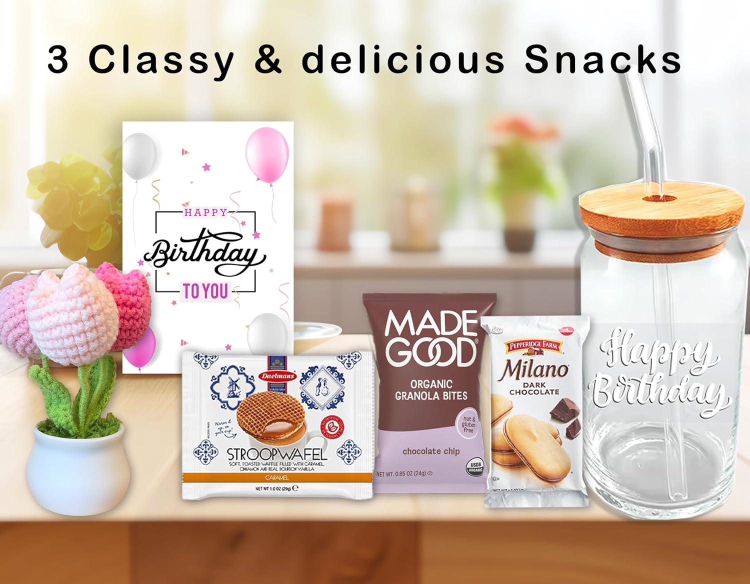 Celebrate her special day with the ultimate Happy Birthday gift basket for women—thoughtfully designed to bring joy, comfort, and a touch of luxury. Inside, she’ll discover an inflated birthday balloon, a handmade crochet flower, a scented candle, and a glass drink bottle with a wooden lid and straw. She can snuggle up with the plush comfort tassels throw blanket while enjoying two delicious snacks and a crispy wafer. The included greeting card makes it easy to add your personal message, making this the perfect present for a mom, sister, best friend, aunt, or grandma. Whether near or far, this unique care package is a beautiful way to say “Happy Birthday” and make her feel truly special.