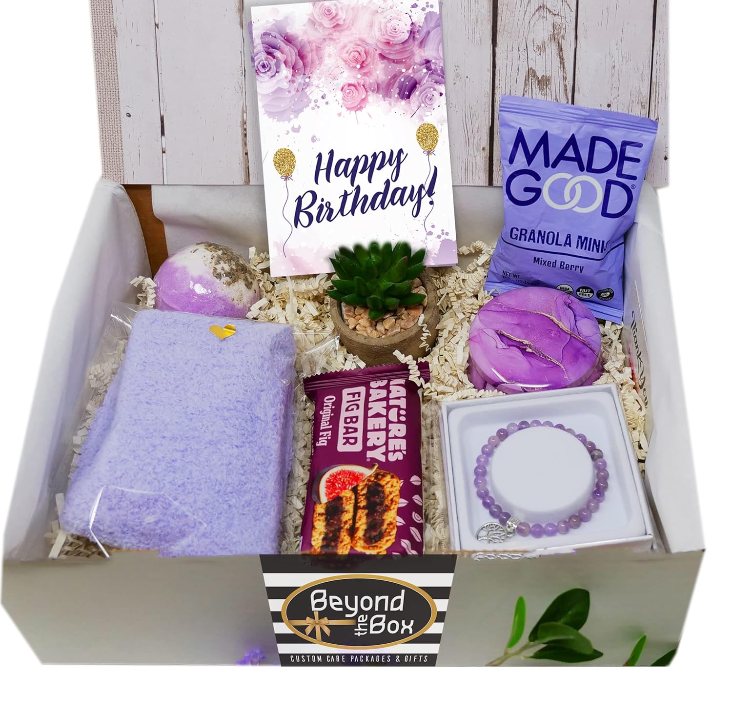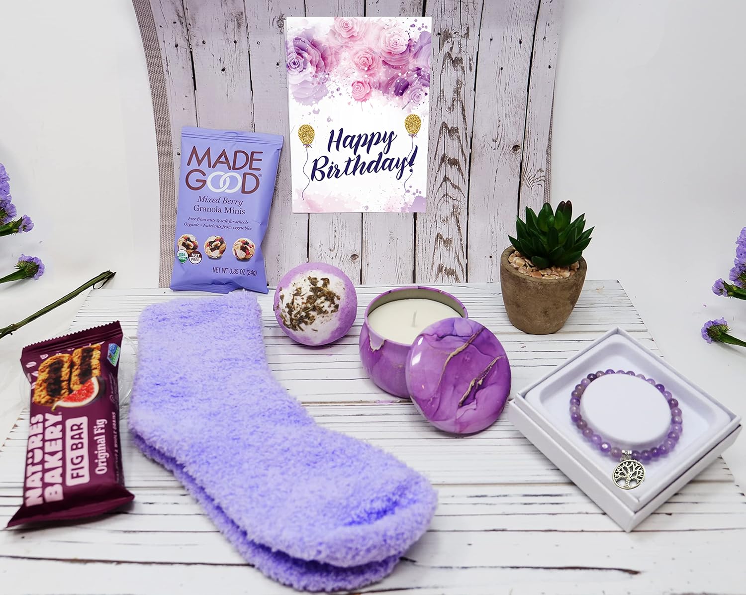 - ♥Includes one pack of Tree of life bracelet purple jewelry / Purple bath bomb, Purple candle, succulent artificial plant, Fig bar, Granola Bar balls, Purple soft fuzzy socks, Happy Birthday greeting card (blank back for writing)