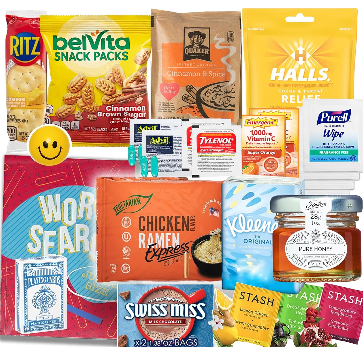 - β Soothing Snacks & Drinks β Includes 3 tea bags, Electrolit for hydration, honey jar, oatmeal crackers, Vegetarian Ramen and hot cocoa mix to warm and comfort during sick days.