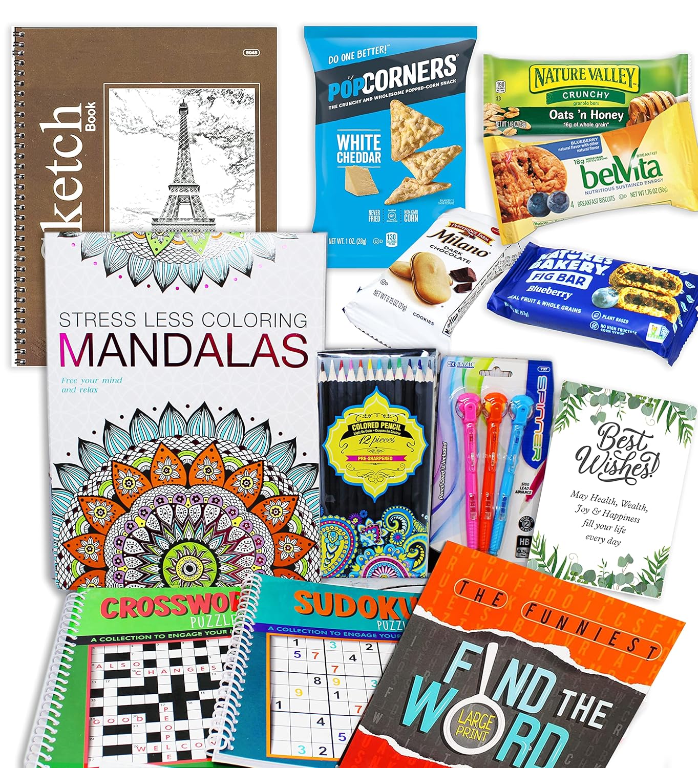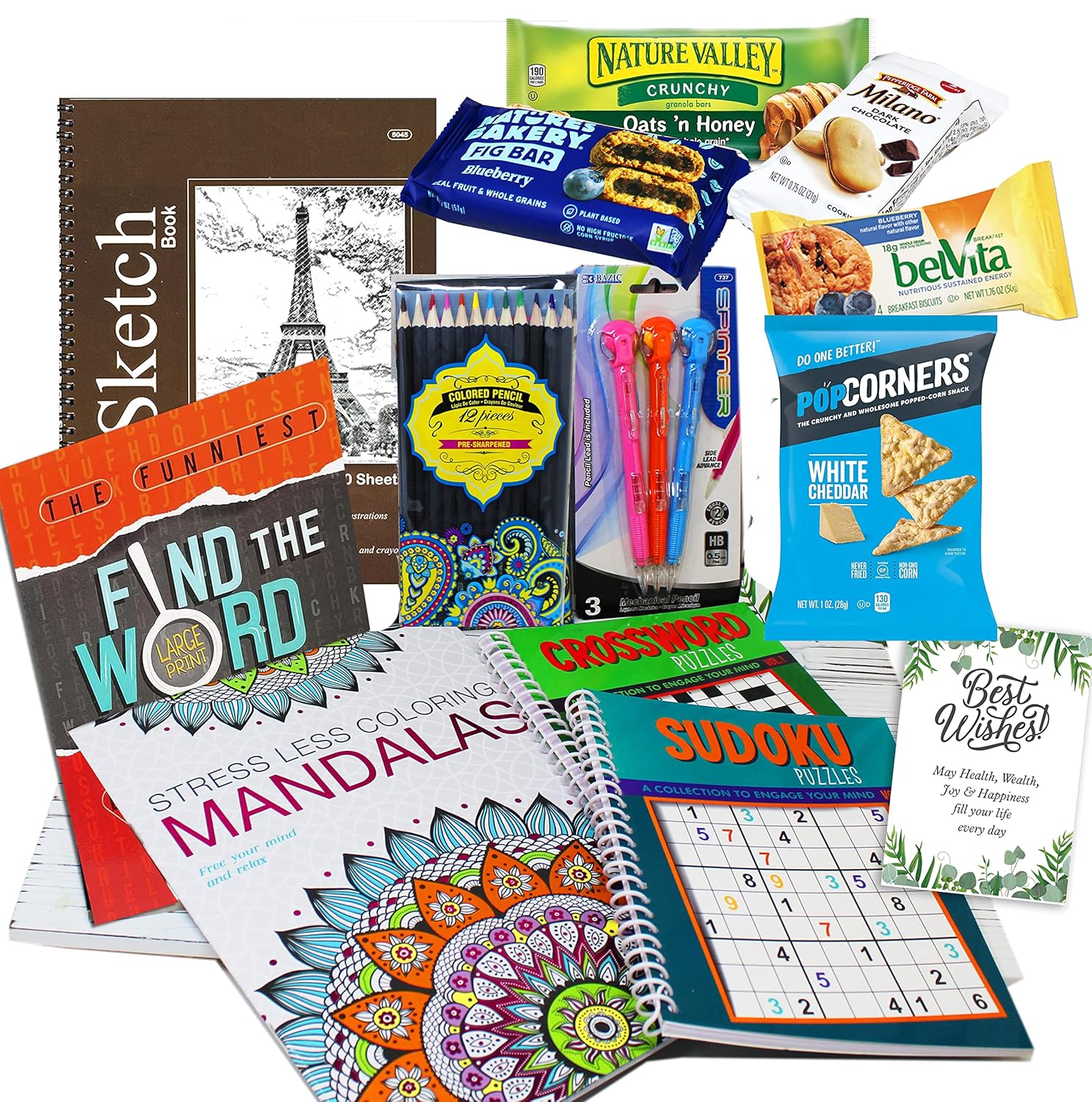 - ♥♥ BUNDLE GIFT BASKET INCLUDING: Word search (or word hunt), Mandala coloring book, Sudoku, crosswords puzzle book, Sketch book, colored pencils & mechanical pencils. & a postcard / Greeting card with Best Wishes Wording, the postcard has a blank back side for your option to handwrite your message