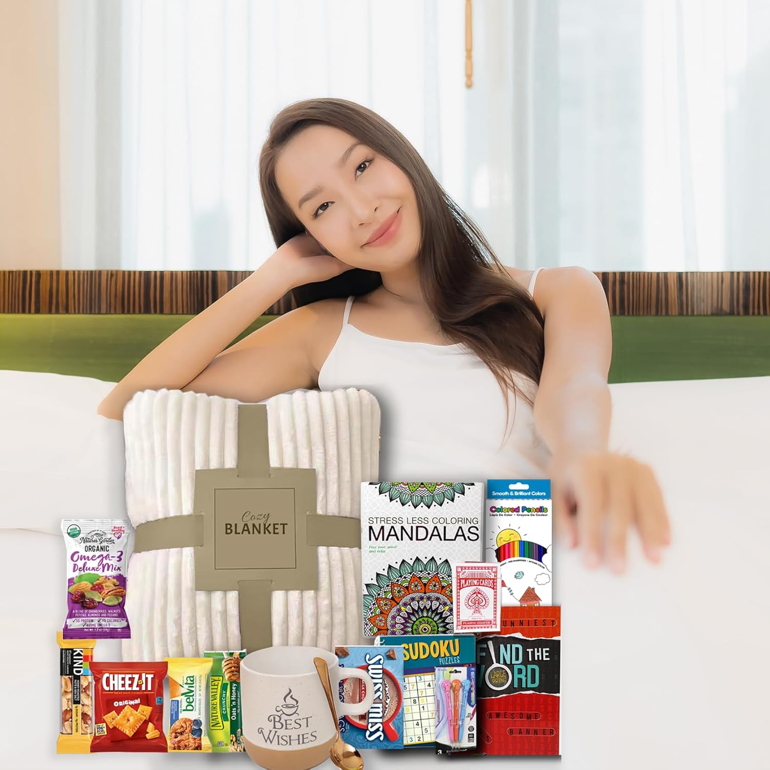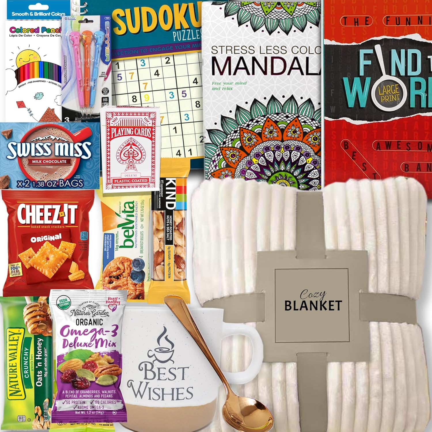 GET WELL SOON Gift basket Art set kit gift with Blanket | Home, Hospital After surgery recovery gift, Activity Books care package | Feel better soon for sick friend & Great Snack Variety
