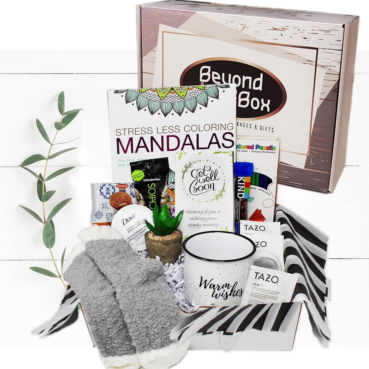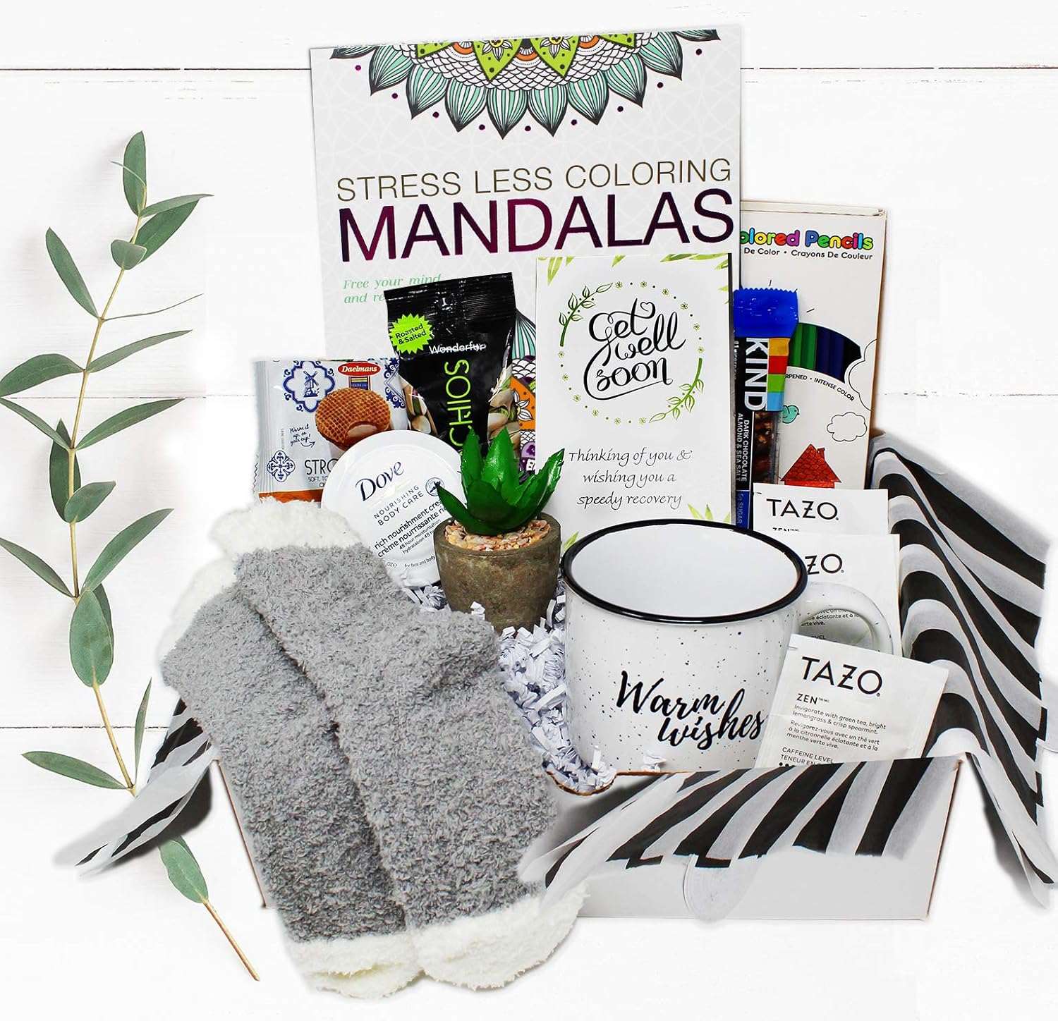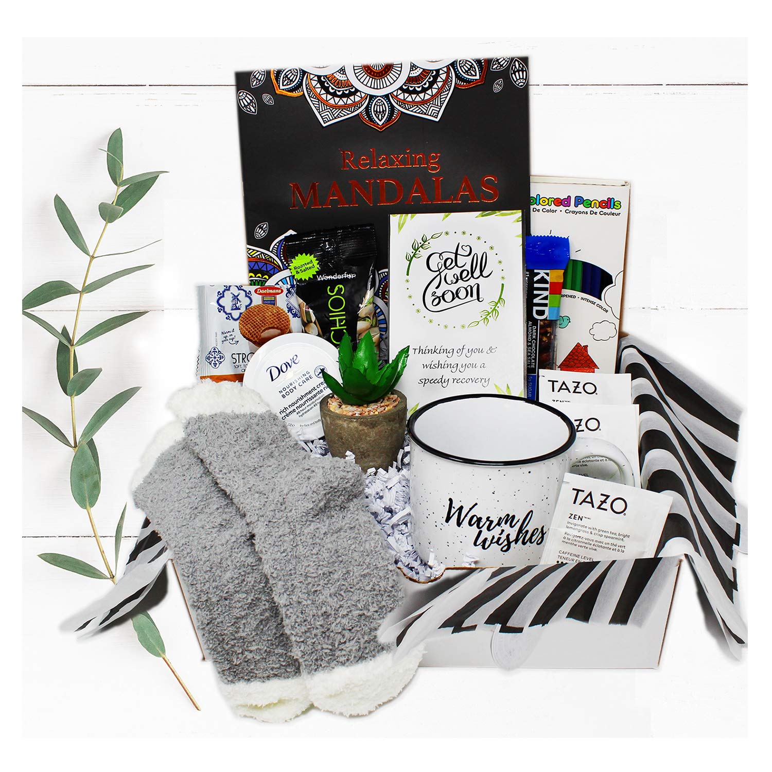 This Get Well Soon care package is perfect for women recovering from an illness or surgery. The box includes one pack of Soft Imported Waffles, Wonderful Pistachios (1.5 oz), one Kind Granola Bar (random flavor) 14 oz ceramic coffee mug, four Tazo Zen Green Tea Bags, soft fuzzy socks, Dove Rich Nourishment Cream, one Get Well Soon card, 12 colored pencils, and one large adult coloring book for relaxation (random design). one small artificial plant succulent. Safely send your mom, girlfriend, or wife a gift basket during quarantine!