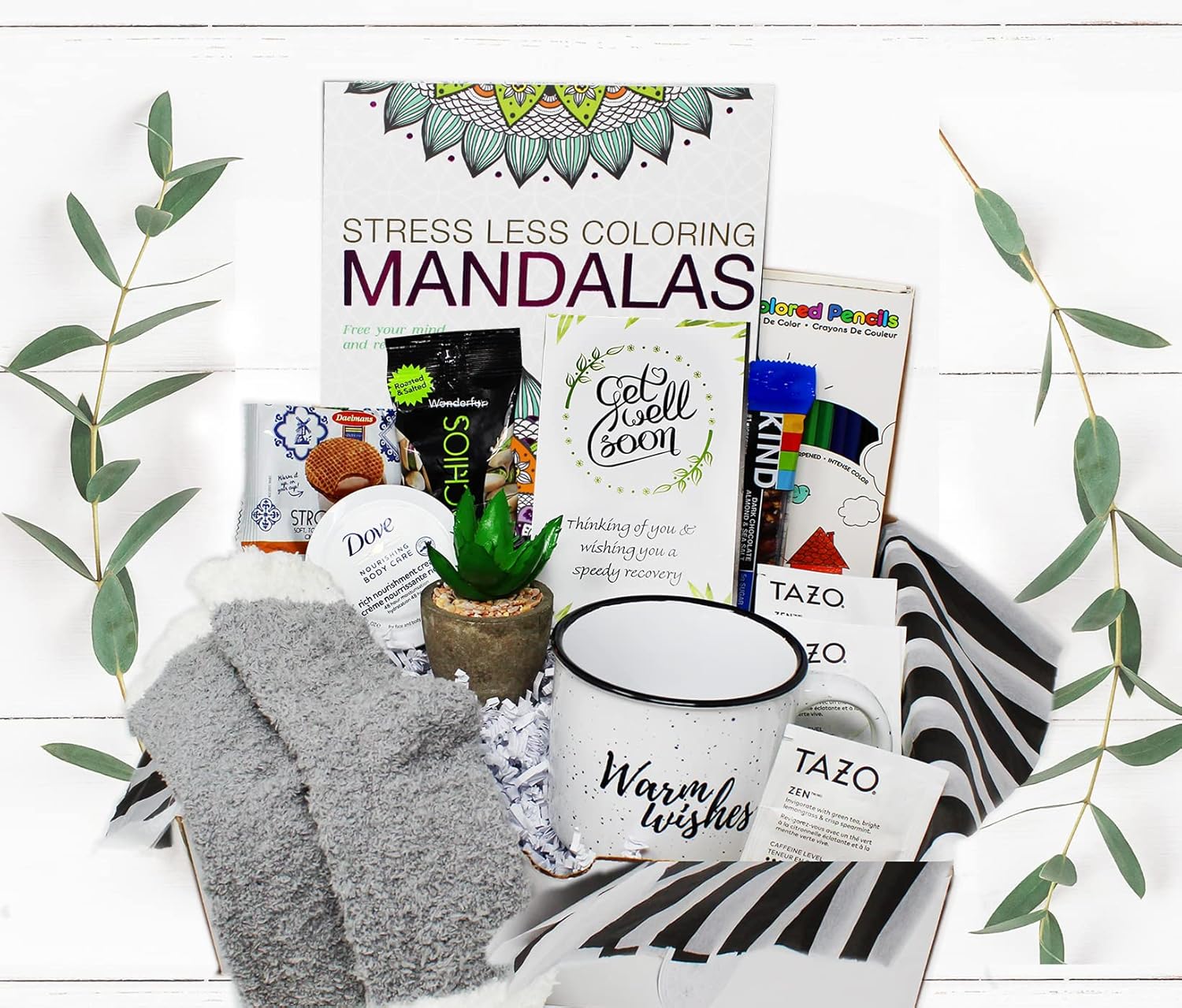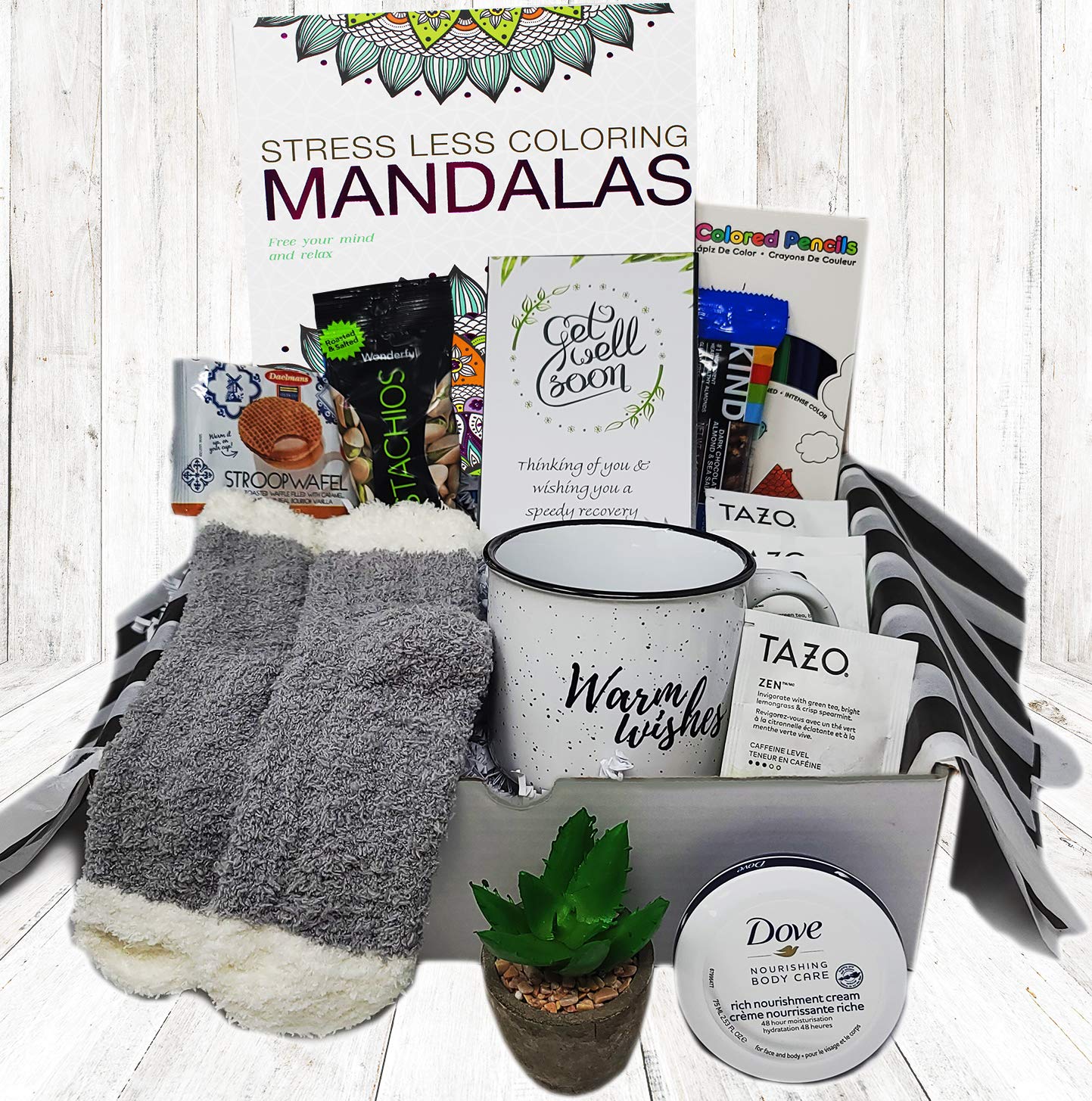 - ♥Includes one pack of Premium Ceramic Coffee / Tea mug ( 14 oz.) 4 Tazo tea bags, Soft Imported Waffles, Wonderful Pistachios (1.5 oz), one Kind Granola Bar (random flavor), soft fuzzy socks, Dove Rich Nourishment Cream, one Get Well Soon card (blank back for writing), 12 colored pencils, and one large adult mandala coloring book for relaxation (random design) and one small artificial plant succulent.