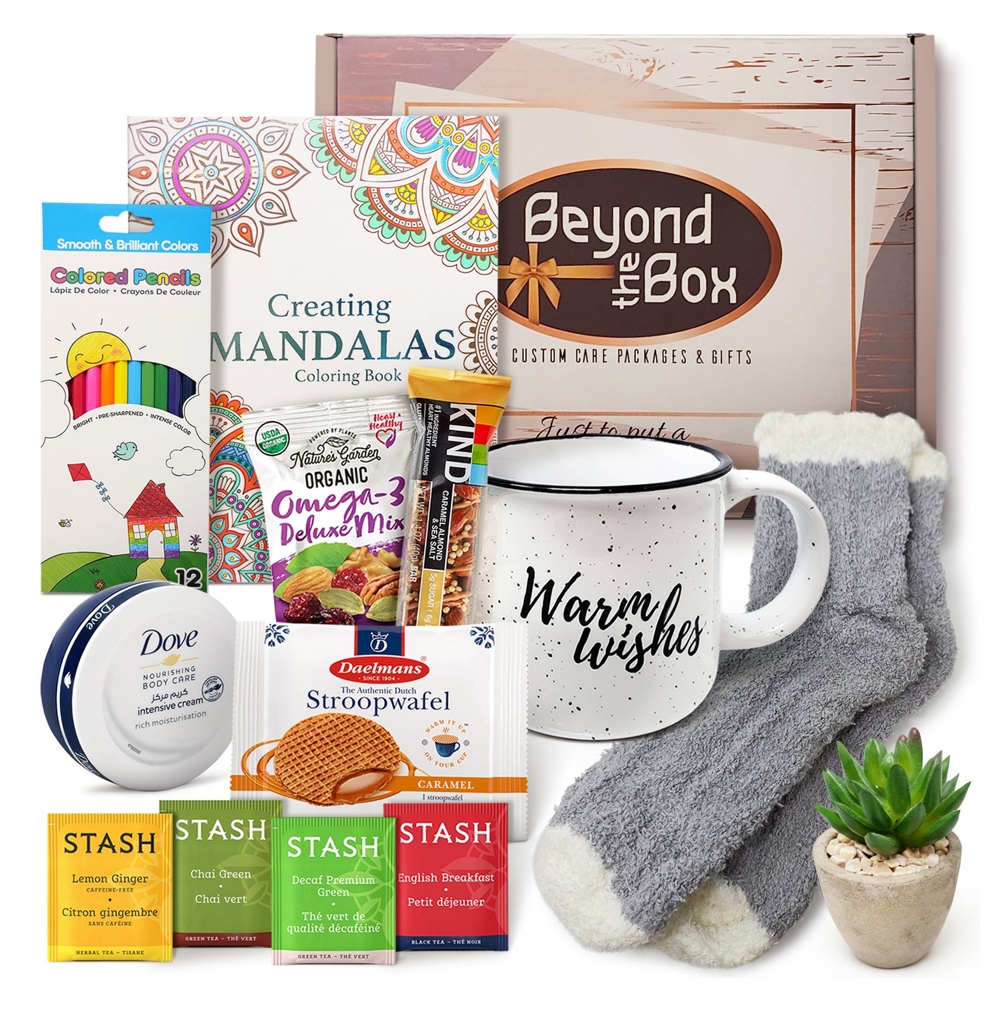 - ♥Includes one pack of Premium Ceramic Coffee / Tea mug ( 14 oz.) 4 tea bags, Soft Imported Waffles, , one Kind Granola Bar (random flavor), soft fuzzy socks, Dove Rich Nourishment Cream, one Get Well Soon card (blank back for writing), 12 colored pencils, and one large adult mandala coloring book for relaxation (random design) and one small artificial plant succulent.