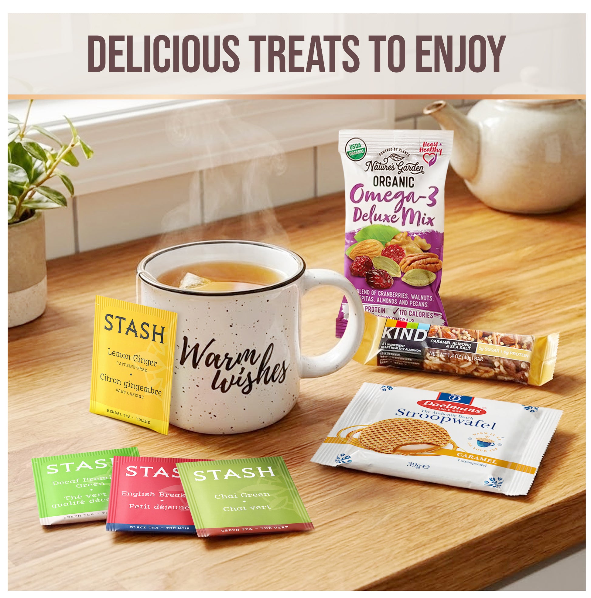 This cozy variety box includes 4 soothing tea bags and a ceramic mug for calming moments, along with fuzzy warm socks to provide everyday comfort. A charming succulent plant adds a touch of life and positivity, while a selection of delicious snacks offers a simple, uplifting treat.