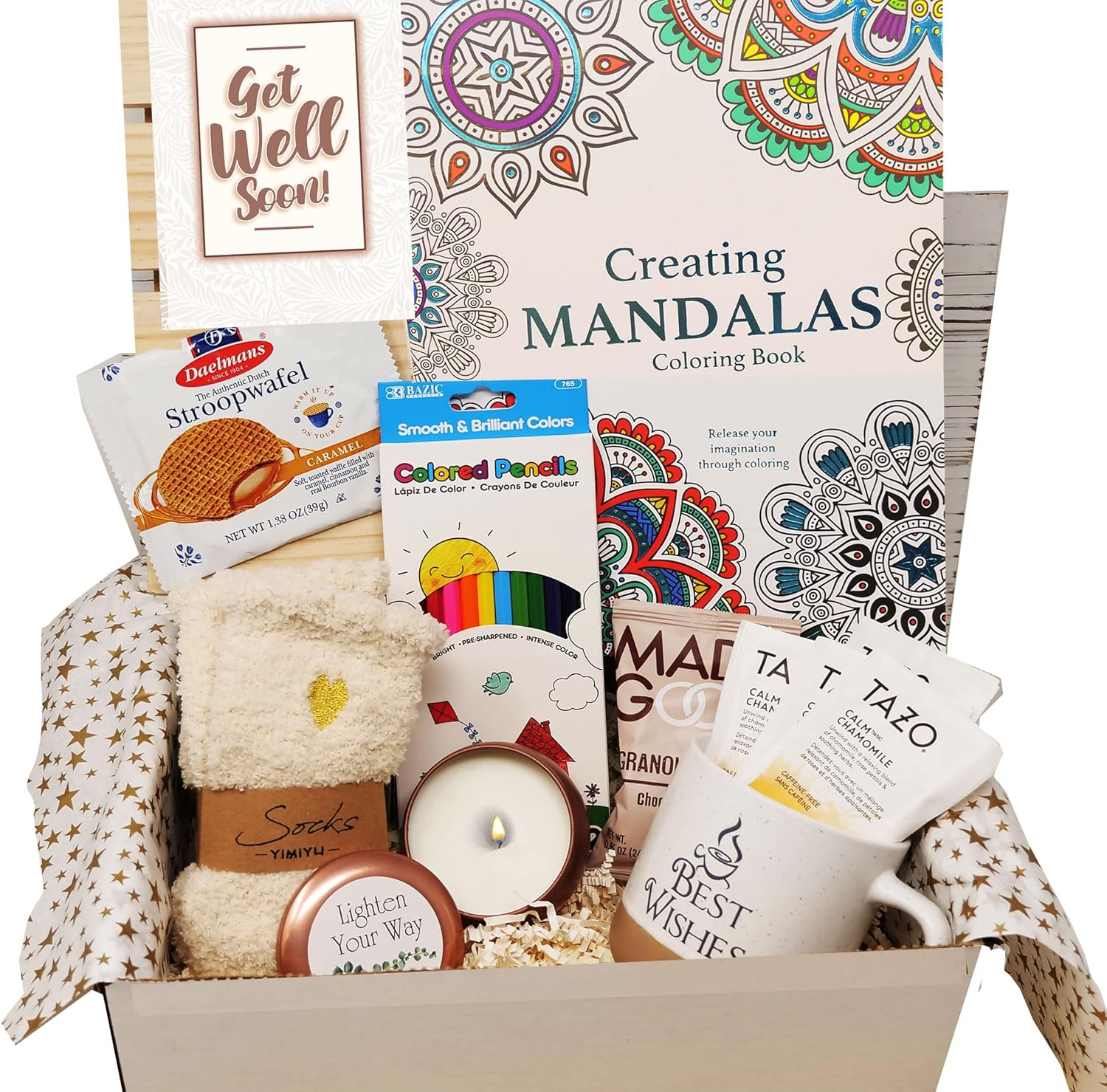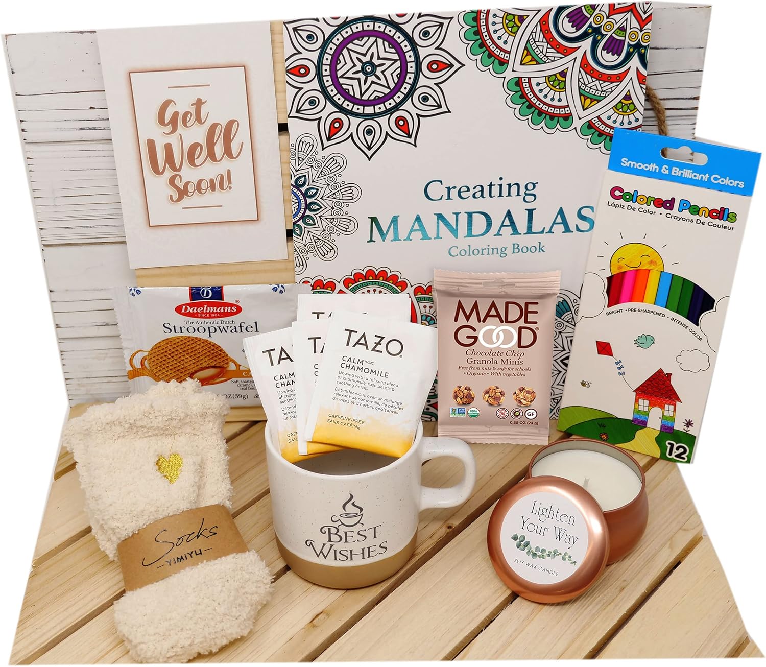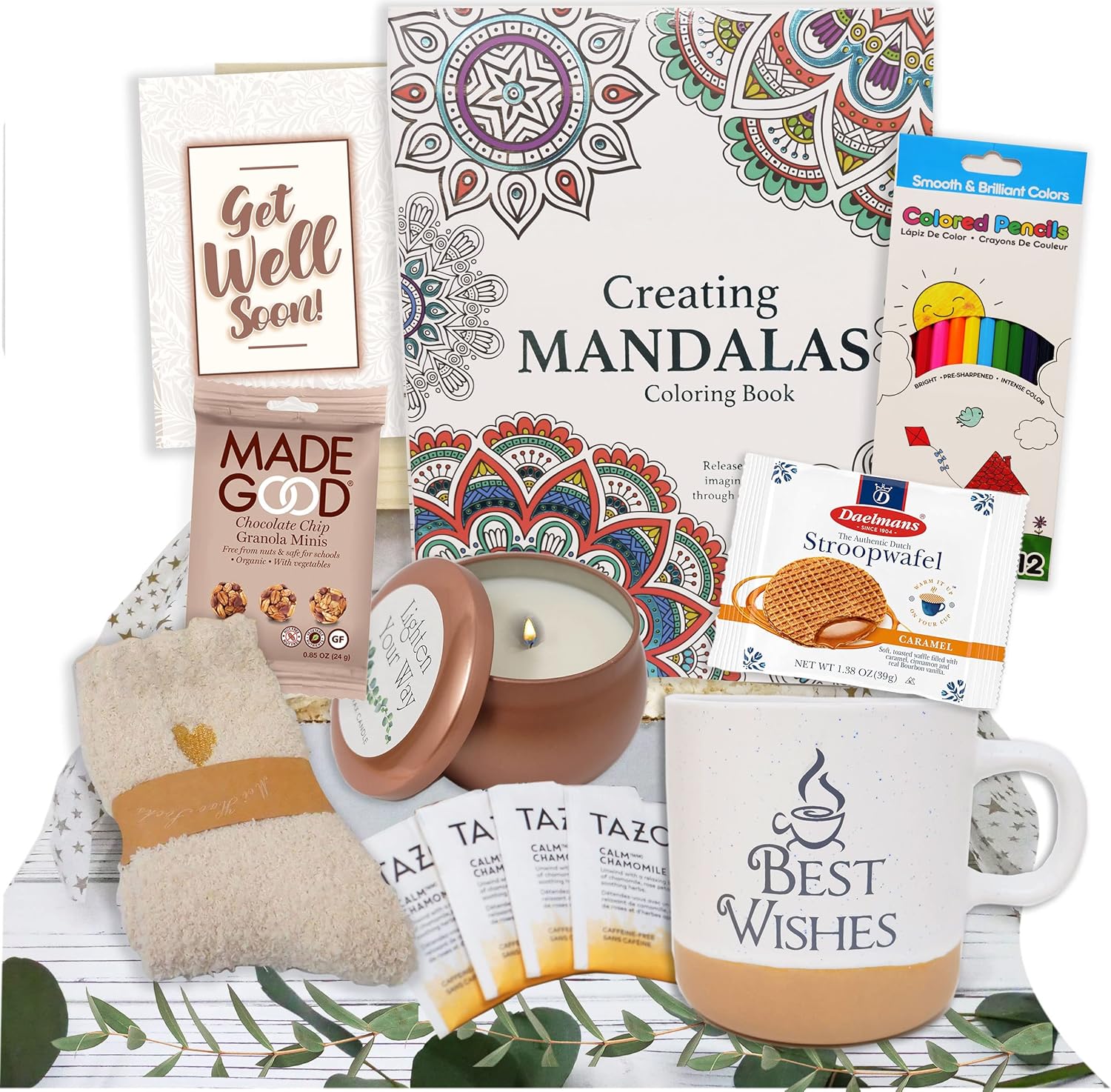 - ♥Includes one pack of Premium Ceramic Coffee / Tea mug, 4 Chamomile tea bags, Soft Toasted Dutch Waffles, Granola balls, Soft fuzzy socks, Scented Candle in a tin, 12 colored pencils, and one large adult mandala coloring book for relaxation (random design) and color pencils, Get Well Soon card (blank back for writing).