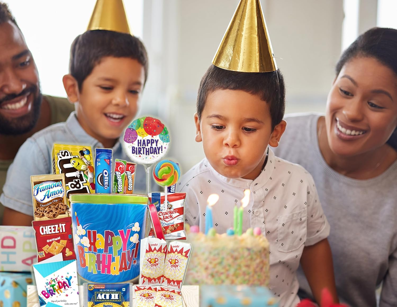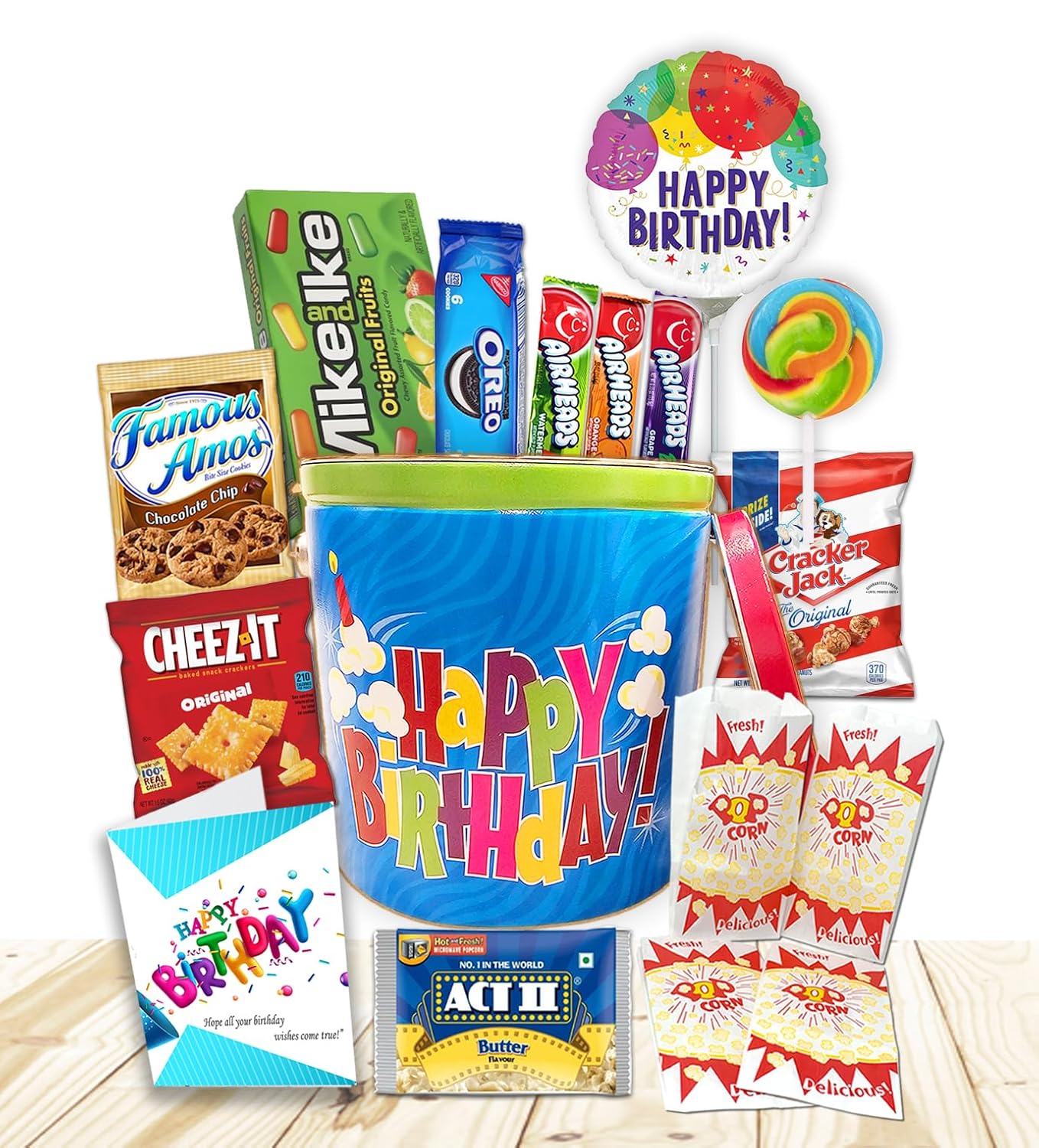 Happy Birthday Gift Basket full of goodies for Kids & Teenagers β Reusable Tin with Balloon, Snacks, Candy, Popcorn, Cookies, Savory Treats & Greeting Card β Birthday Care Package for Boys & Girls