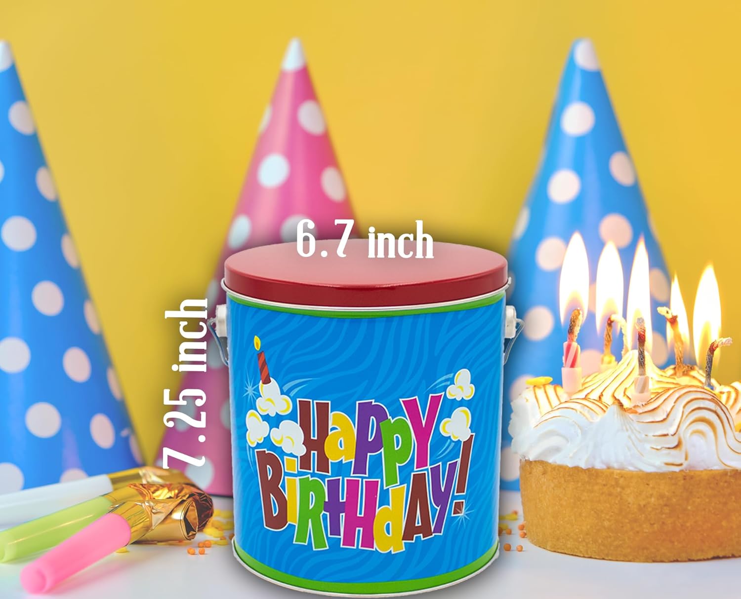 - β»οΈ Reusable Colorful Tin β The round birthday tin doubles as a keepsake container they can use again and again! Measures 7 inch x 6.5 inch