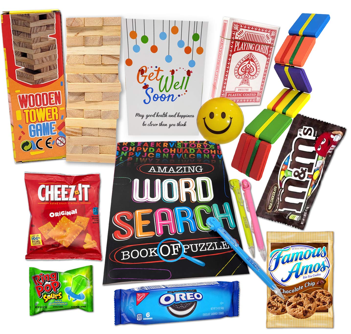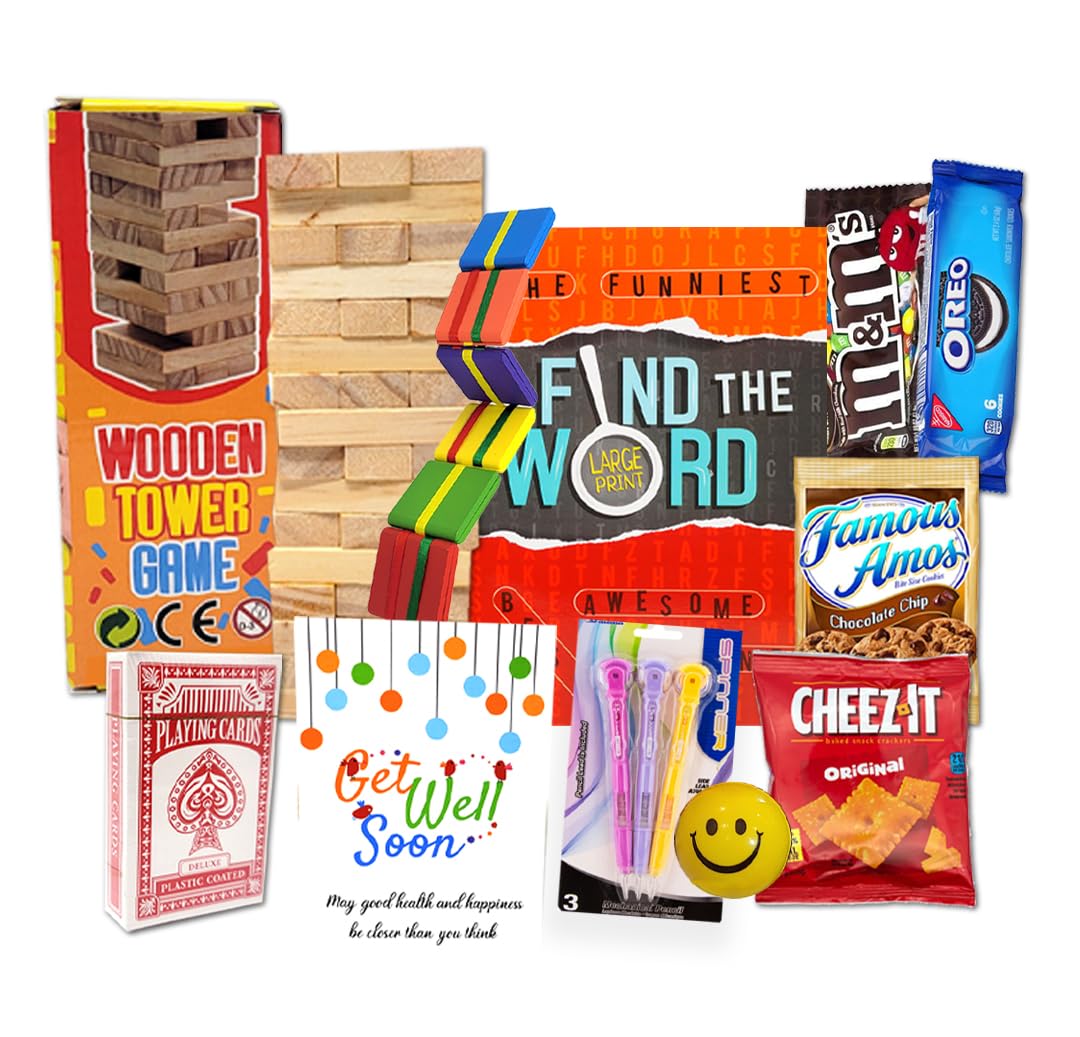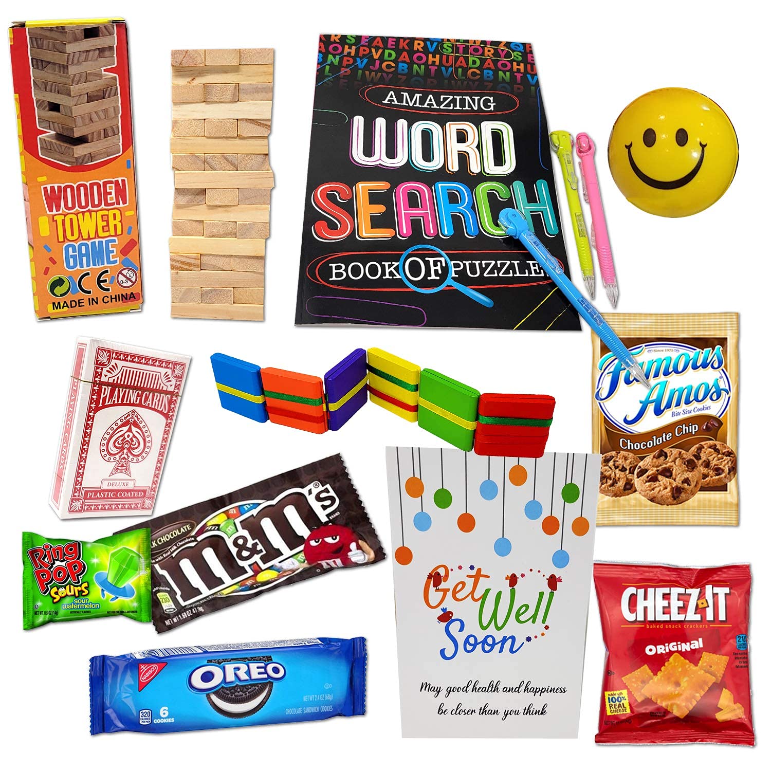 - ♥Package including: 6" WOODEN TOWER GAME 72/37 2.5" STRESS SILLY FACE BALLS, 12"WOODEN JACOB'S LADDER, Word Search activity book, Spinner Top Eraser Mechanical Pencil, Get Well Soon Greeting card with blank back with the option to hand write your own greeting, Playing cards pack