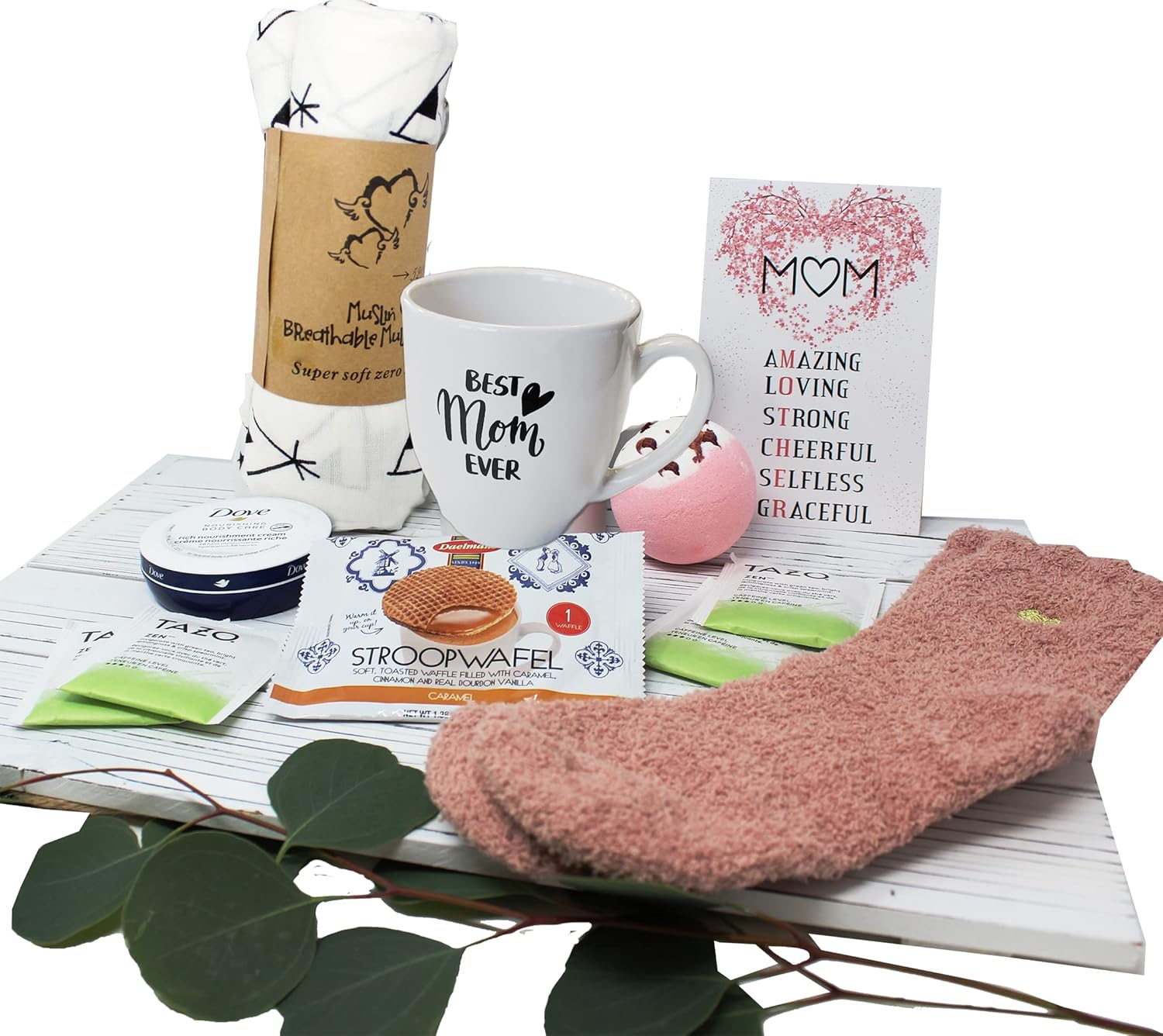 - ♥Best Present Idea for First Time Mommy Full of goodies, Contains: Coffee / Tea mug, Premium Musline Swaddle for wrapping a new born baby , Fuzzy Socks, 4 Tazo Tea bags, Dove cream, Bath bomb, Daelmans Stroopwafels & Greeting post card for Mother ( back size blank that you can add your own hand Witten message