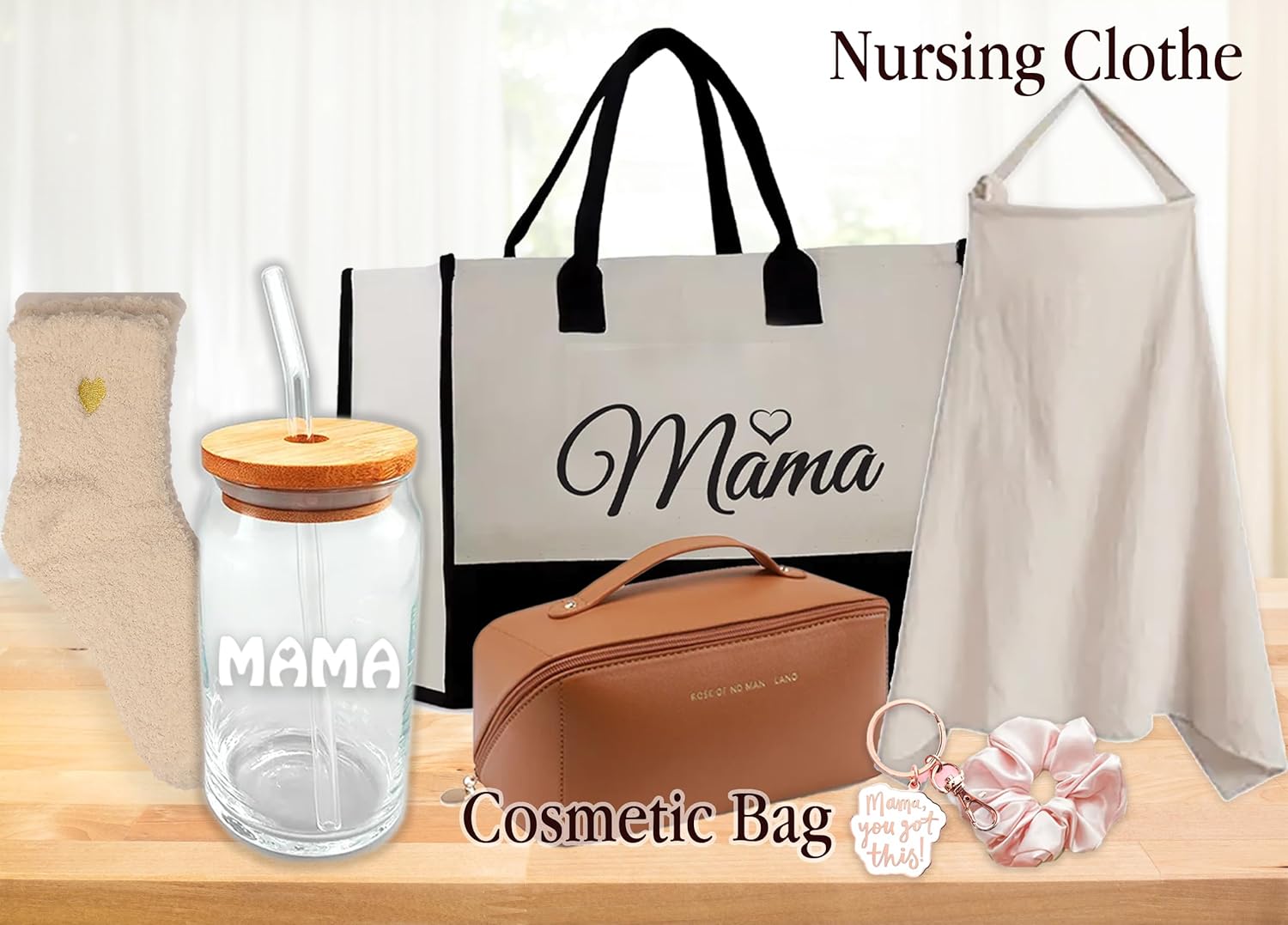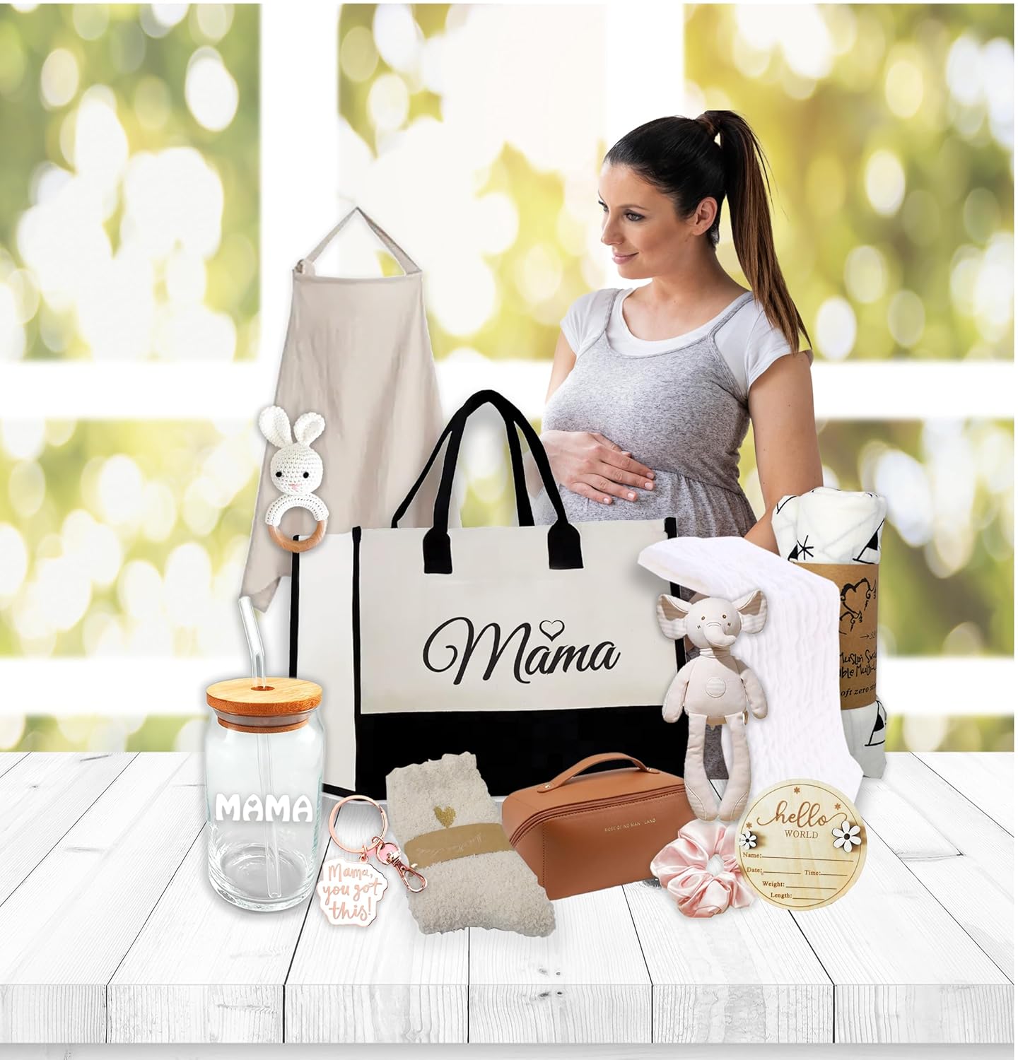 - ♥ ♥Including: for Mom, Modern reusable cloth shopping bag, Travel Makeup Bag Large Capacity Cosmetic Bags, Soft Mother Outing Breastfeeding Cover Nursing Cotton Cloth, Mom keychain, Mama reusable glass drinkware, Fuzzy socks, scrunchy For Baby: Baby Burp cloth, Elephant friend, bunny rattle, Baby sign for day of birth. Muslin swaddle