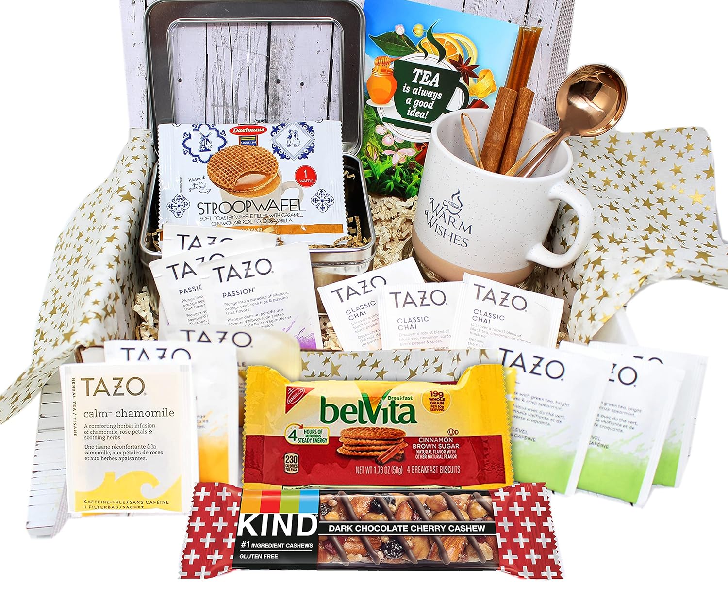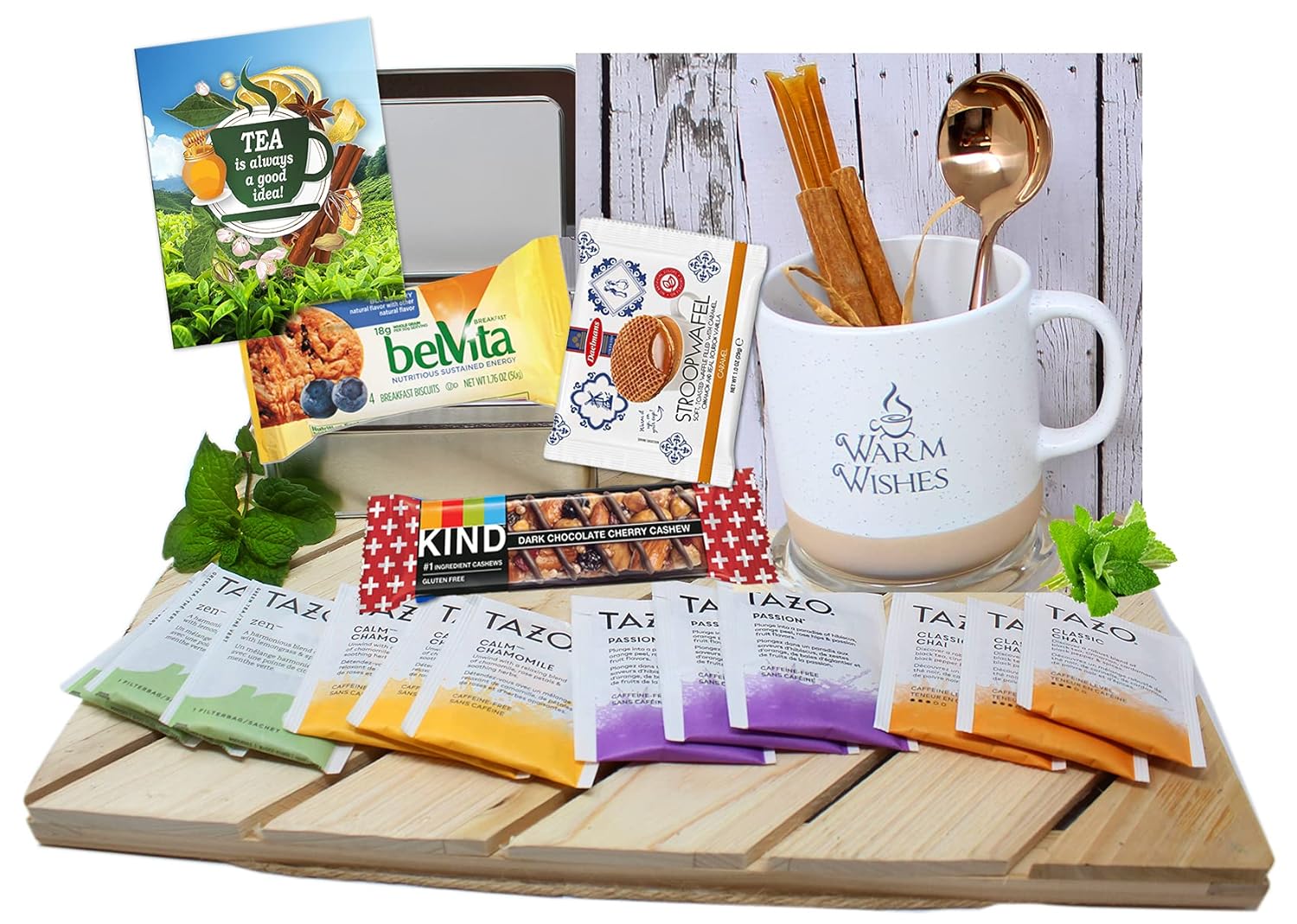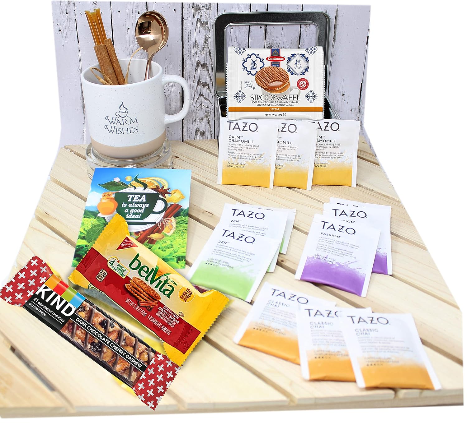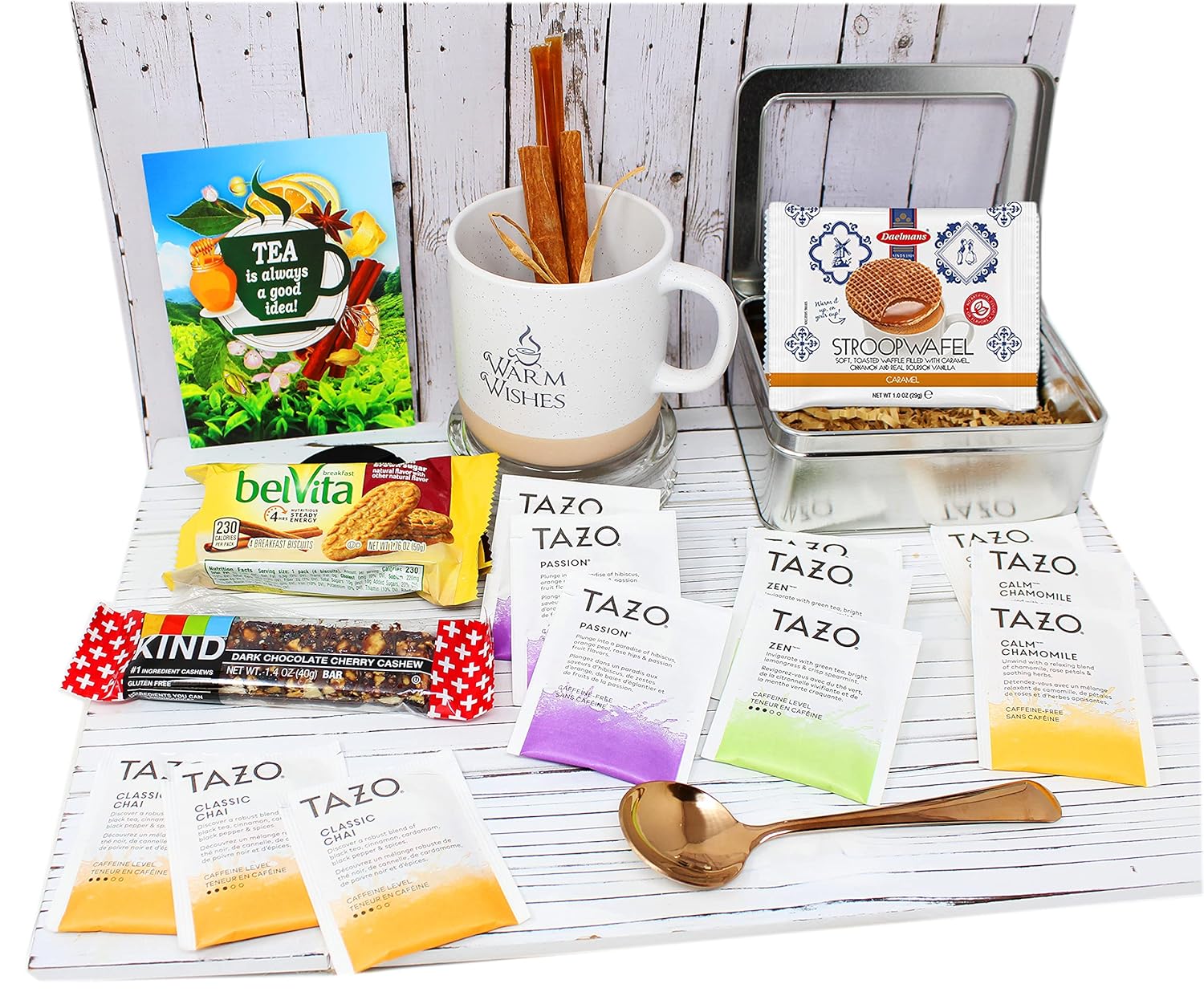- ♥Including Elegant premium tea / coffee mug 12 Pc Teabags : Calm Chamomile Herbal Tea , Zen green tea, Passion Herbal Tea, Chai Black Tea. Classic silver tin with a window, honey sticks , Cinnamon sticks 6 Cookies, Imported toasted Dutch Waffles, Kind bar, Premium Tea / coffee spoon, Postcard / Greeting with a blank back for your option to hand write your personal message