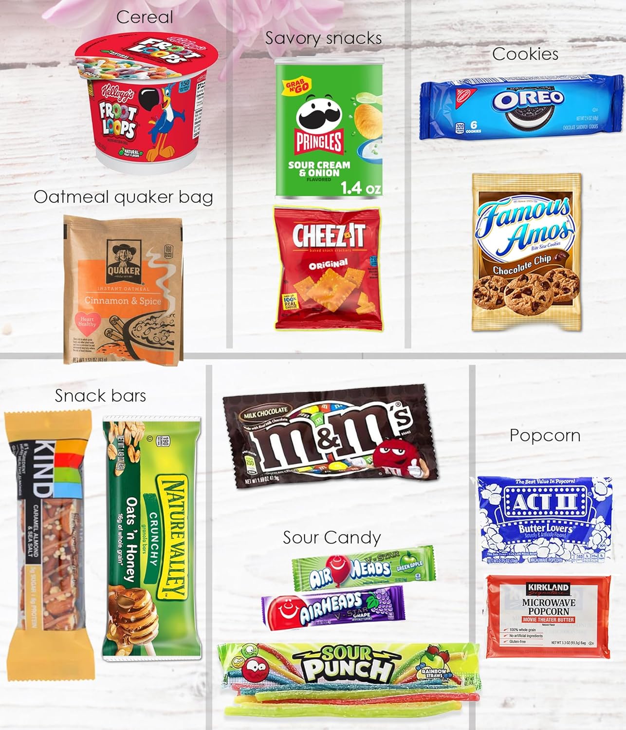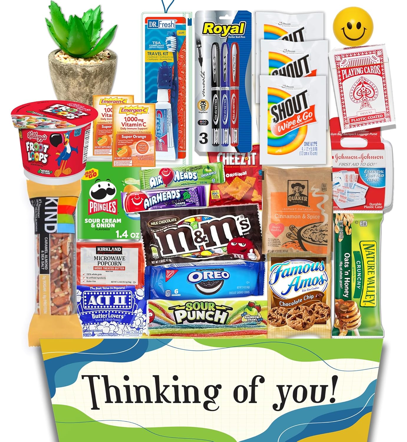 - Delicious snacks: Perfect gift basket From sweet to savory, we've got all the snacks a college student could want, including 2 snack bars, 2 savory snacks, 2 sour snacks, 2 cookies packs, oatmeal, cereal & M&M
