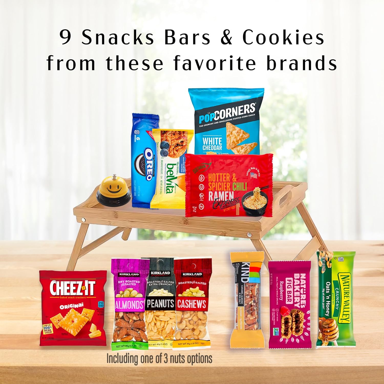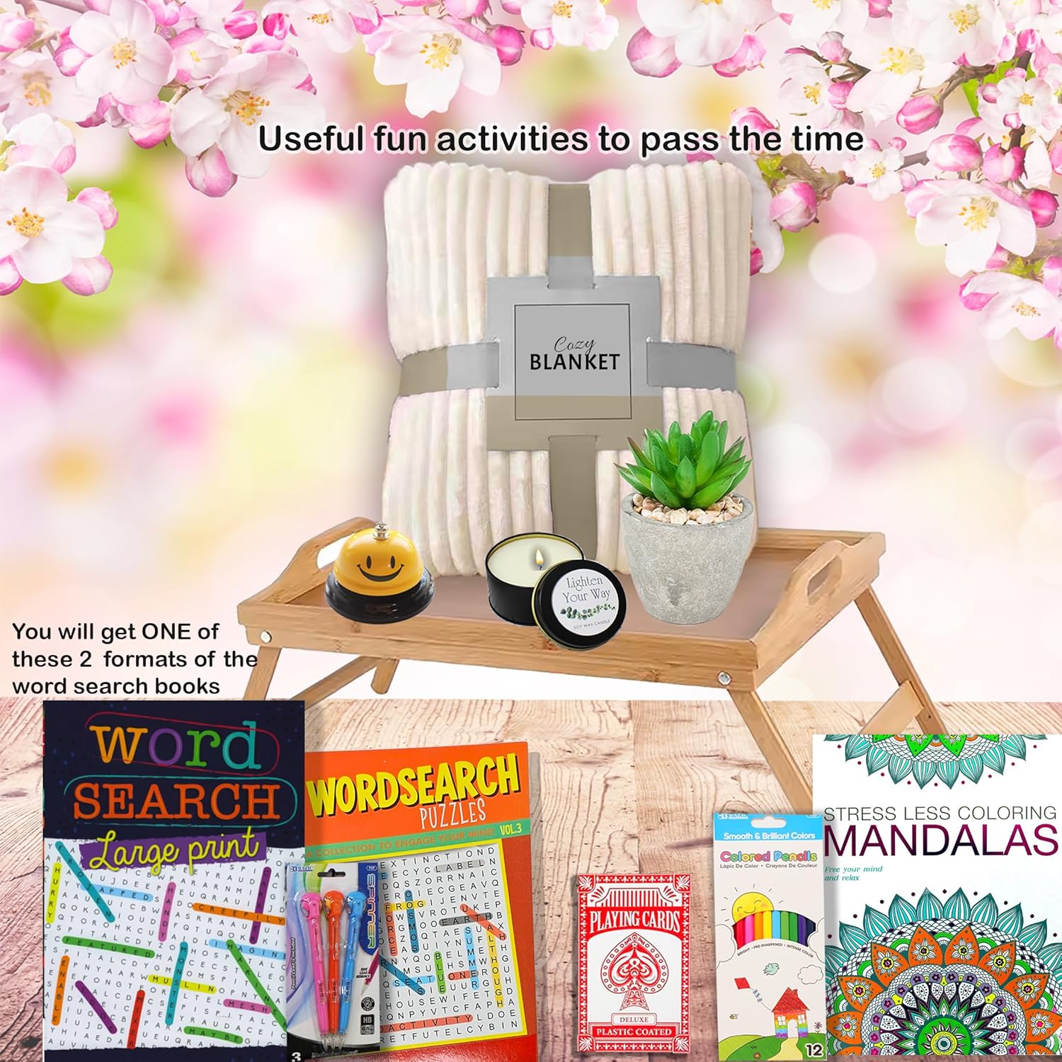 - ♥Package including 19 items, Cozy Blanket, Bamboo folding serving bed tray, sour & savory snacks & cookies, Adult coloring book, word search, pencils and colored pencil, Desk Bell, Plant, Candle, Playing cards.