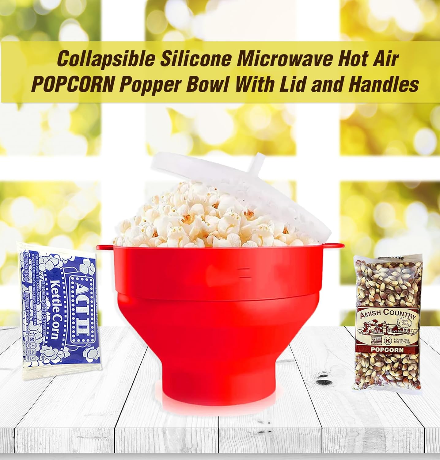 - ♥Popcorn Maker: Collapsible Silicone Microwave Hot Air POPCORN Popper Bowl With Lid and Handles with popcorn kernels, and 1 microwavable Popcorn