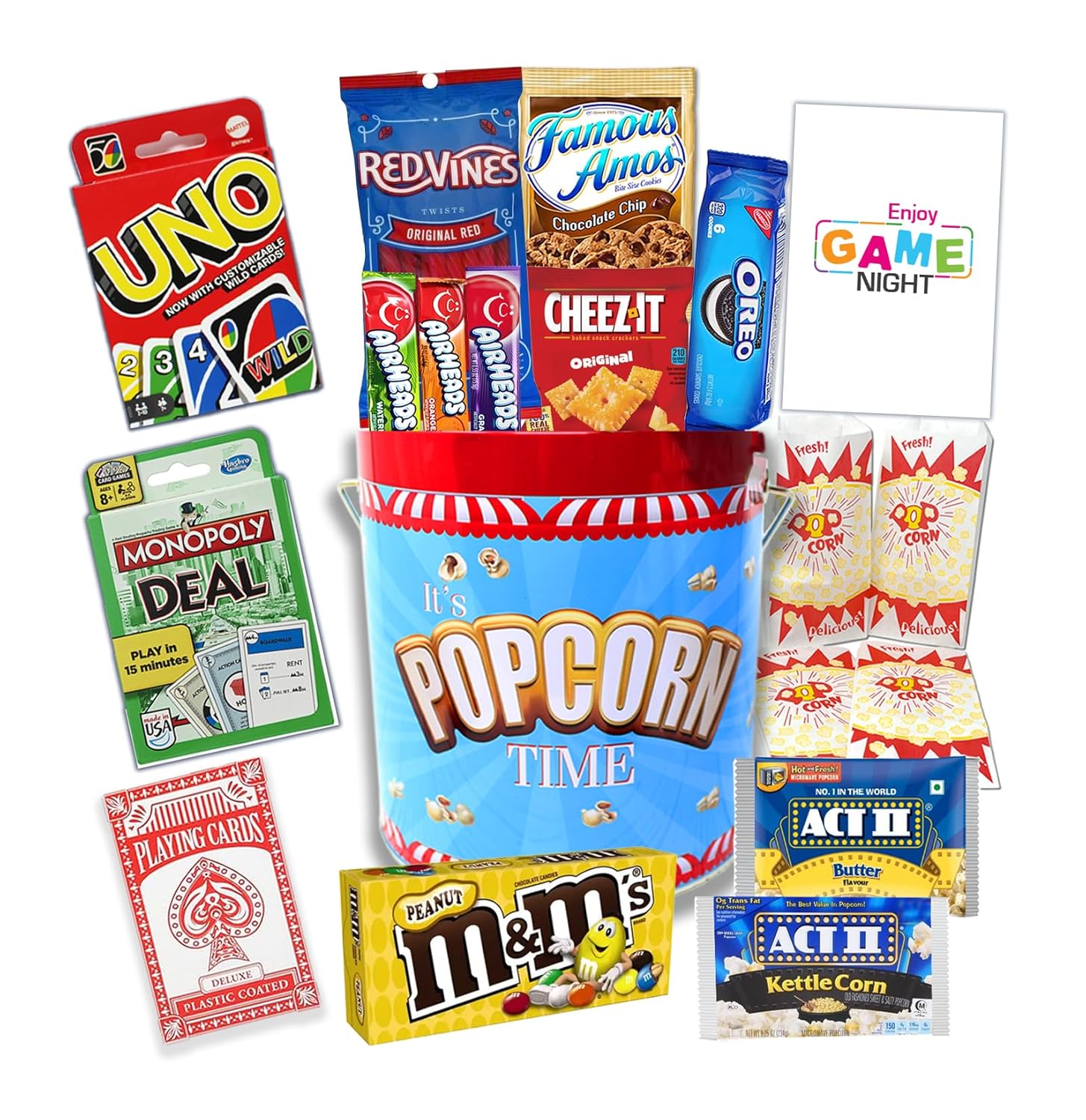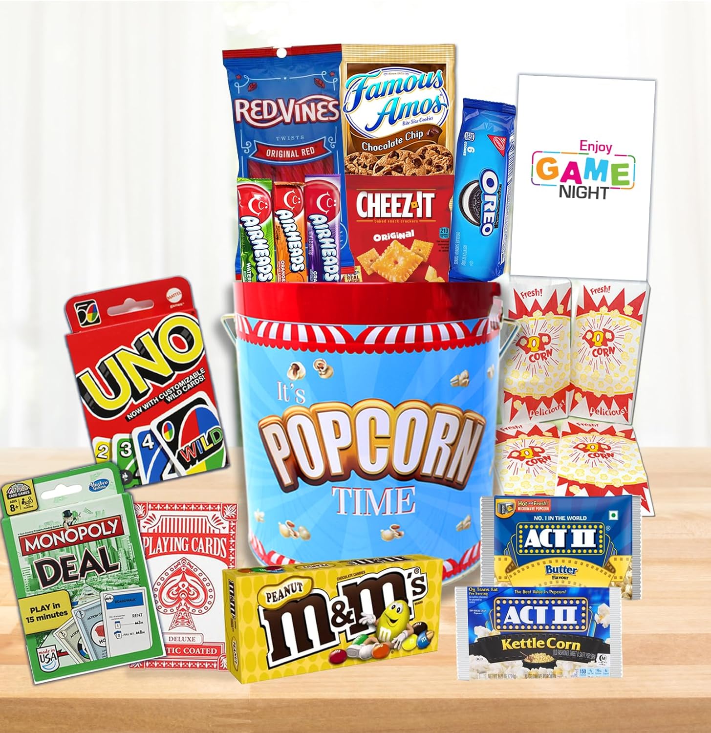 Ultimate Game Night Gift Basket – In a reusable popcorn Tin container, w/Classic Card Games, Popcorn, Snacks & Candy for Family Fun!" Birthday gift, movie night gift or party