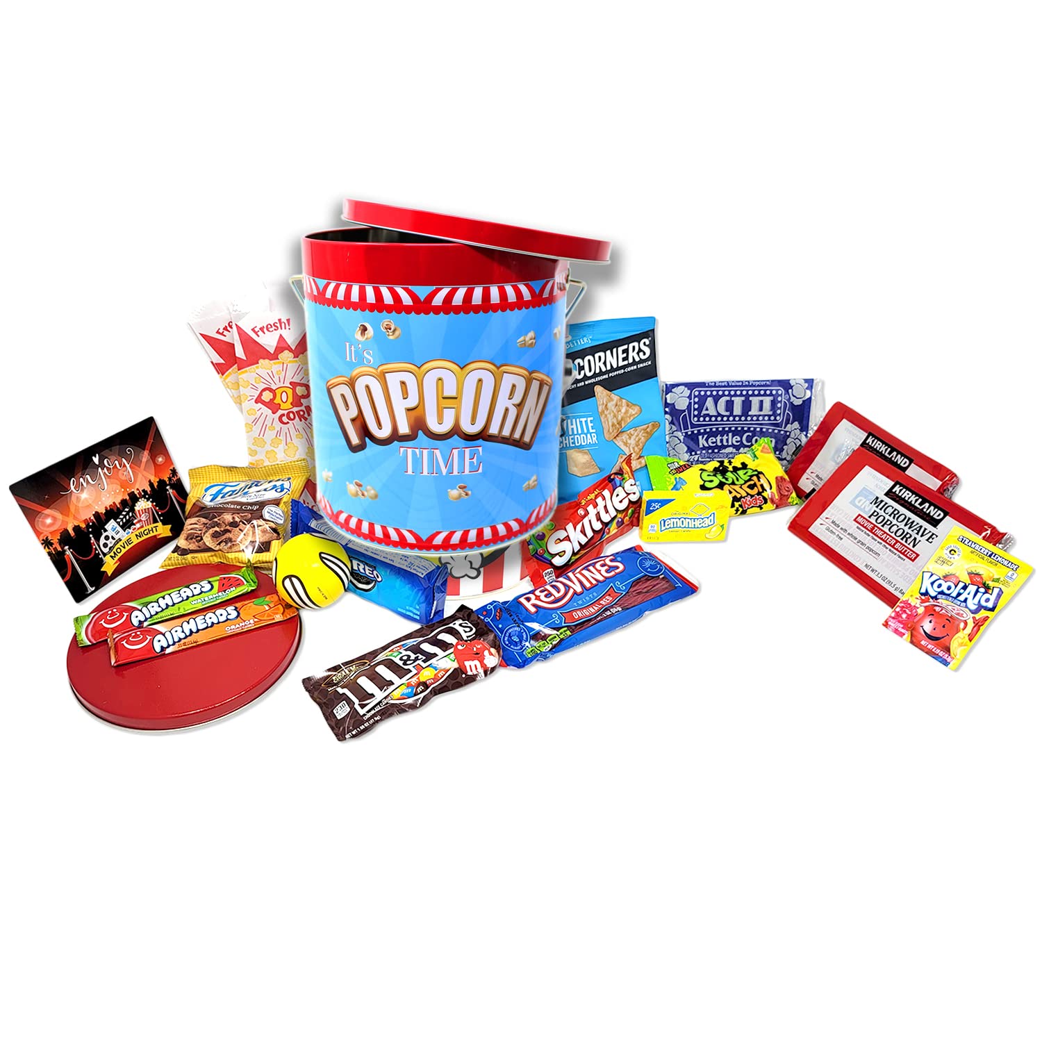 - ♥ Popcorn Lover Movie Night gift basket: Items included: large ‘Popcorn’ 1 Gallon Premium reusable tin, a stress ball, 4 decorative popcorn paper bags to fill with popcorn, 2 bags of Kirkland Movie Theater Butter Microwave Popcorn ( 3.3 oz.) , 1 Act II Kettle Corn, Popcorners 1 bag out of 3 flavors: Sea salt, White Cheddar or Sweet & Salty kettle corn ( 1 oz.), 1 pack of Red Vines ( 2 Oz.) , 1 Sour Patch Kids ( 2 oz.) ,